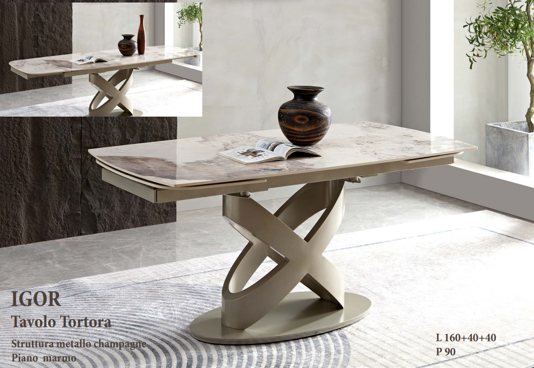 Design moderno e raffinato, il tavolo Igor offre eleganza e solidità grazie alla sua struttura in metallo e grazie alle due allunghe si ha la possibilità di adattarlo in base alle proprie esigenze.