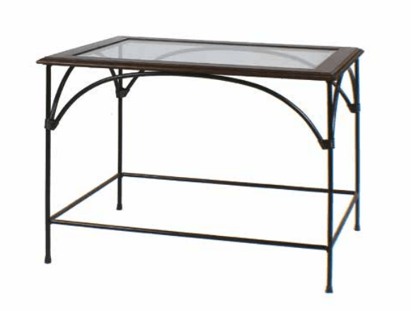 Tavolino realizzato in ferro battuto incorniciato in vetro.